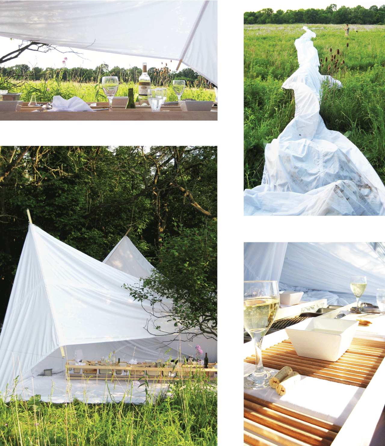 A dining pavilion, a collaborative project, is nestled amongst trees. Suspended fabric creates a soft enclosure and frames a view towards the field. The table, designed as a machine for eating, contains the cooking method and food storage.